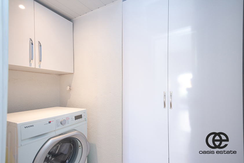 Es gibt außerdem einen separaten Hauswirtschaftsraum mit Waschmaschine und zusätzlichem Stauraum, was den Komfort bei längerer Nutzung erhöht.