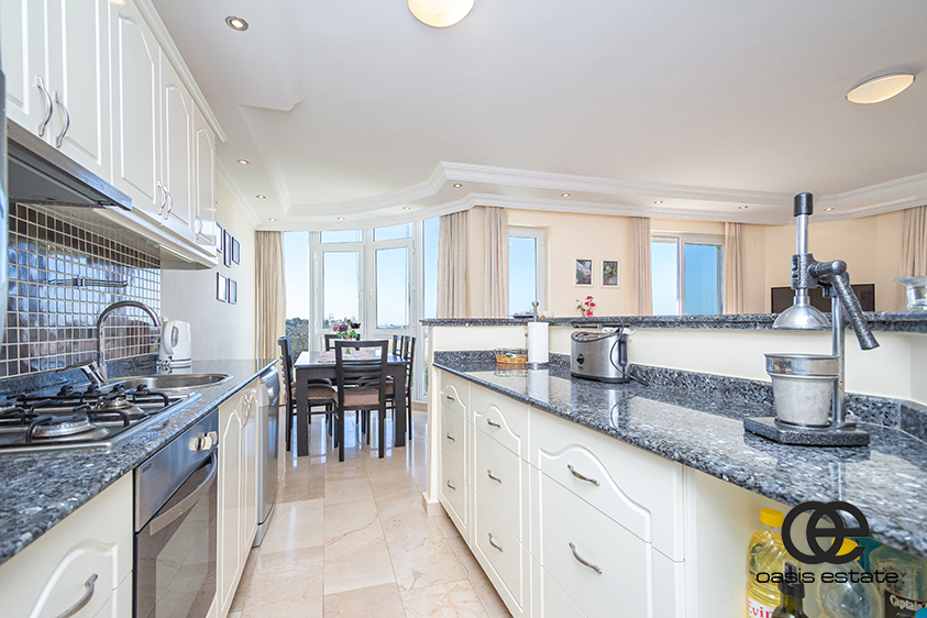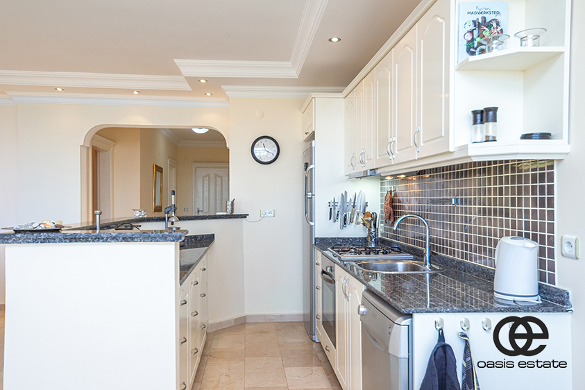Die offene Küche ist komplett eingerichtet und mit Haushaltsgeräten ausgestattet. Sie verfügt über eine Arbeitsplatte aus schwarzem Granit, die einen modernen und eleganten Touch verleiht. Alle Klimaanlagen in der Wohnung sind neu und sorgen das ganze Jahr über für Komfort.