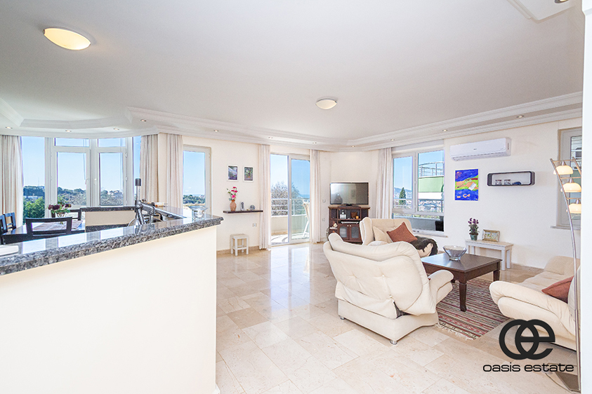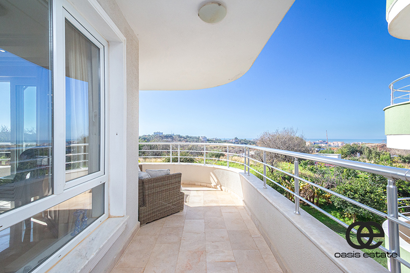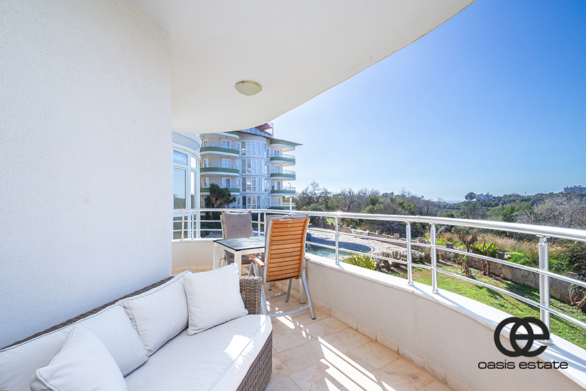 Die Wohnung bietet eine schöne und freie Aussicht, darunter Meerblick, Gartenblick, Blick auf die Burg von Alanya und Blick auf das Gelände der Anlage und den Swimmingpool, was eine entspannte und malerische Wohnumgebung schafft.
